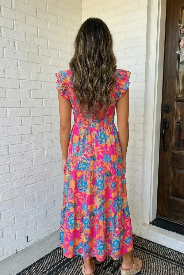 Turn heads and brighten every room in this vibrant floral midi dress! Featuring a bold mix of pink, coral, blue, and golden hues, this piece is made for sunny days and feel-good moments. The smocked bodice offers a flattering, comfortable fit while adding beautiful texture, and the flutter sleeves bring a soft, feminine touch.